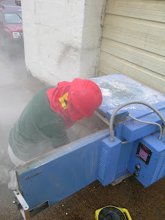 >Studio Artist Sean Hennessey is shown here working on his series of cast glass and concrete panels.