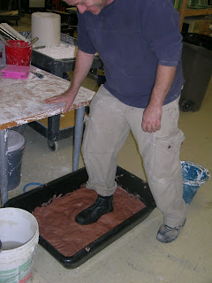 Artist Erwin Timmers is working on a new series – where he plans on casting footprints in glass. To achieve a negative in which he will cast a positive image, he had made a clay ‘original footprint’ . Mixing up clay in a cement mixing trough, Erwin began his foot stomping.