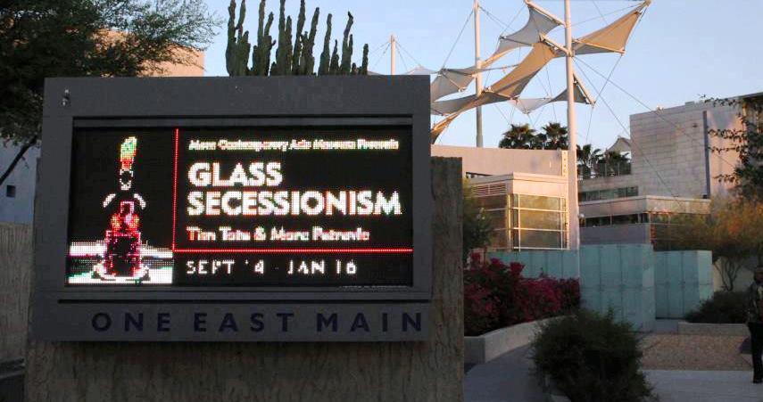 Based on Alice In Wonderland, Sean’s work in the show: Reimagining Alice incorporates cast glass that was painted with concrete and integrates videos, LEDs, EL panels and other media that pulls traditional glass into new realms. Tim Tate and Marc Petrovic also had openings in September – at Arizona’s Mesa Contemporary Arts Museum. Under the title “Glass Secessionism”, the show opened to record crowds.