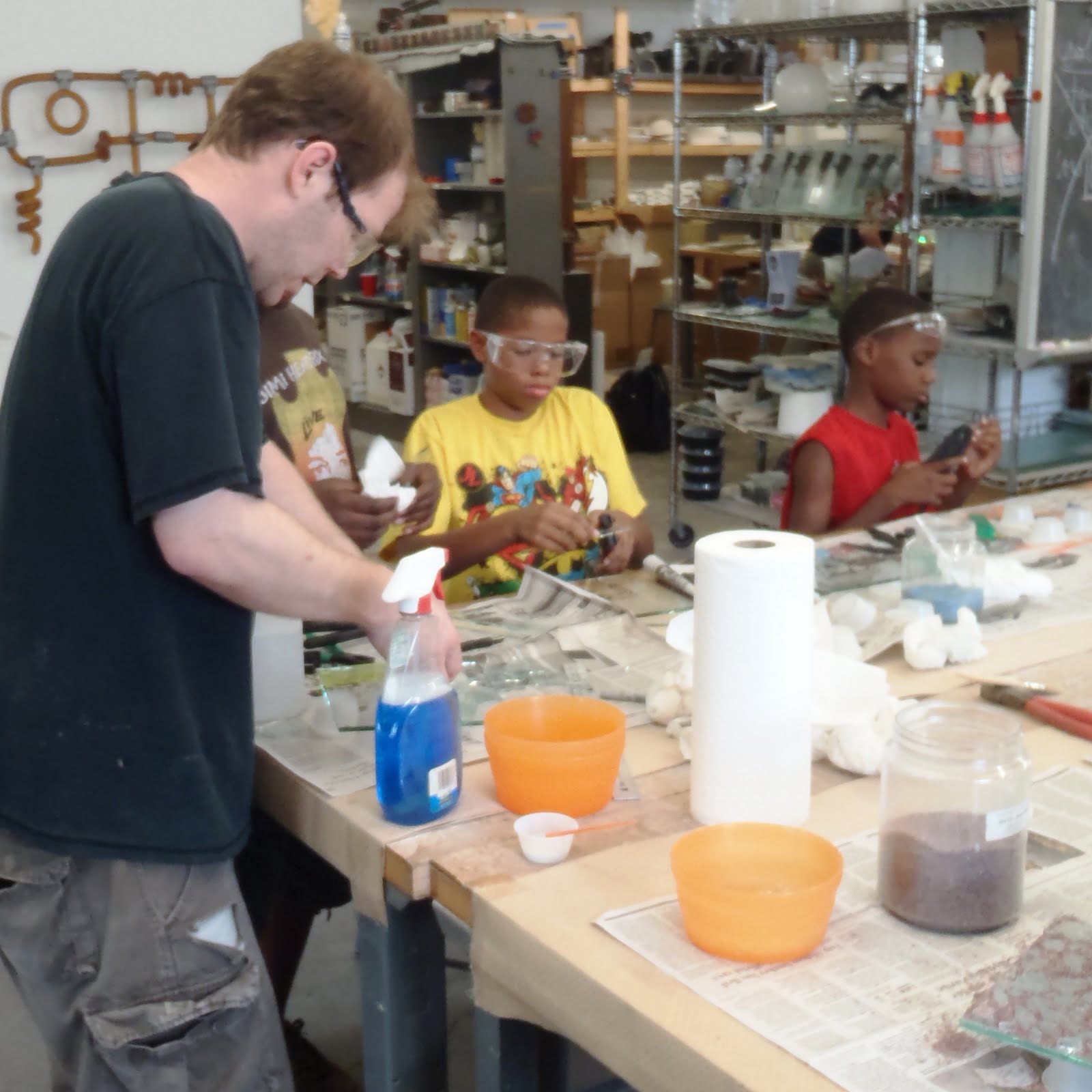 Rob Kincheloe helps direct the children on the finer aspects of working in glass.