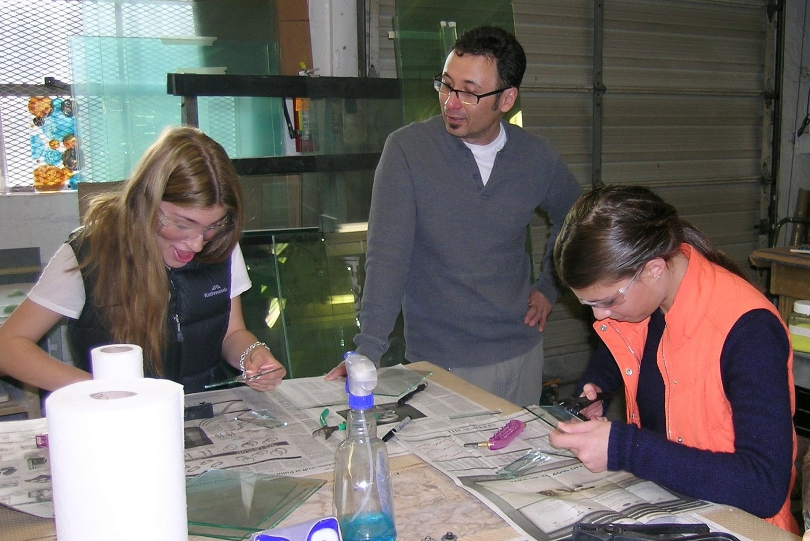 | Tom watches Olivia cut glass, and dons protective eyewear. |