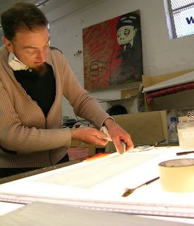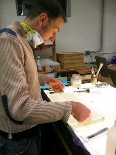 Jeff evaluates and modifies each individual layer of glass as he fires the enamel onto the glass sheets.