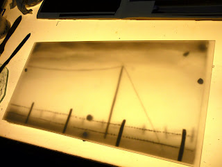 “… glass is not immediately apparent in Jeff Zimmer’s ‘1/1000th the Distance between Me and You (in a Deadrise)’, but it is an essential part of the work. A dark and dramatic object, it is constructed of 22 layers of enameled and sandblasted glass in a light box. In the obscured photograph, an object in the distance that emerges from black clouds under a clearing sky can be faintly discerned: is it a ship or something else? Using a box of cut glass sheets, Zimmer creates the depth and luminosity of a painting, but it is an image that undoubtedly changes every time it is viewed, depending on the angle and the ambient light.”