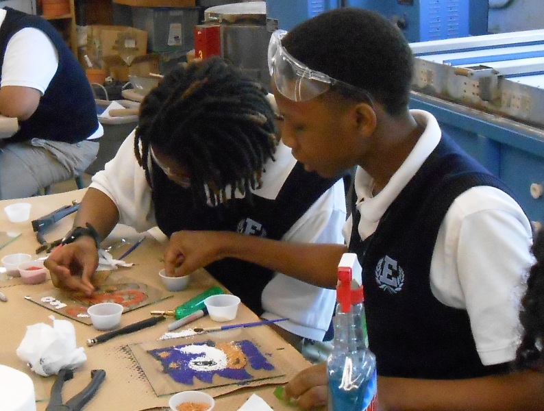This past week, students from Washington, DC’s Eastern Senior High School came to the Washington Glass School for a short course in glass fusing. In each World History unit taught at Eastern Senior High School, a section on art is implemented into the curriculum as a way to encourage students to live a part of history rather than solely read about it. The art class this year was taught by Audrey Wilson, and the class dove right into the thick of it, making beautiful glass.