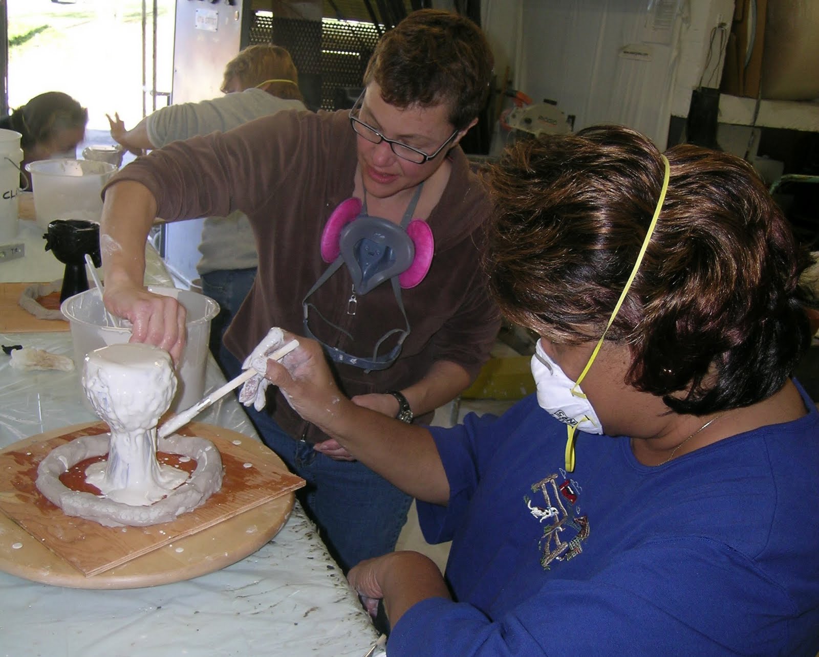 Debra Ruzinsky works with the students on preparing the plaster encasement.
