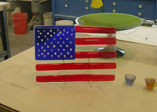 The original proposal was to create a wall of glass, with each cast glass segment combining to create an abstracted image of the USA flag.