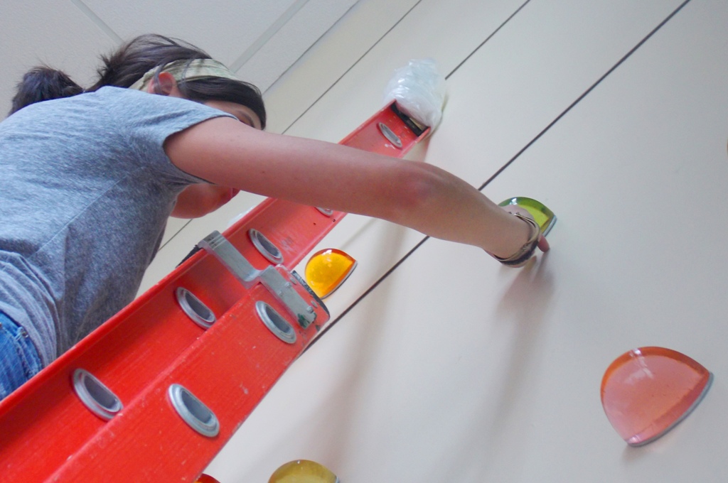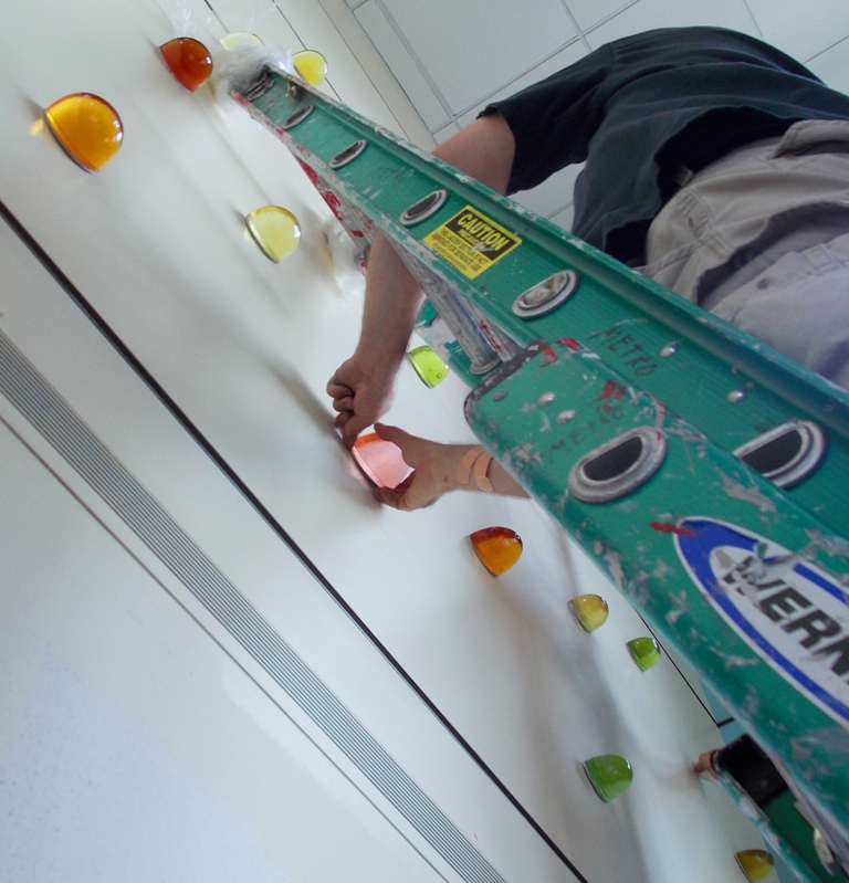 | Audrey Wilson adjusts the location of the colored glass. Said Audrey “I like the way the analogous color scheme creates a harmonious balance throughout the building lobby”. |