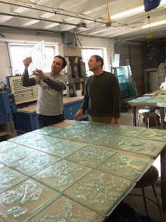Erwin check the glass for evenness of form and to make sure the panels will lay flat within the steel framework.