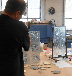 The central portrait of Mr Schar is made from crushed black glass powder. The fine powder was carefully manipulated with scalpel and brushes to form the detailed likeness and took many hours and kiln firings to complete.