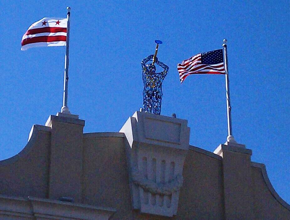| “Jazz Man” tops the refurbished Howard Theater. |