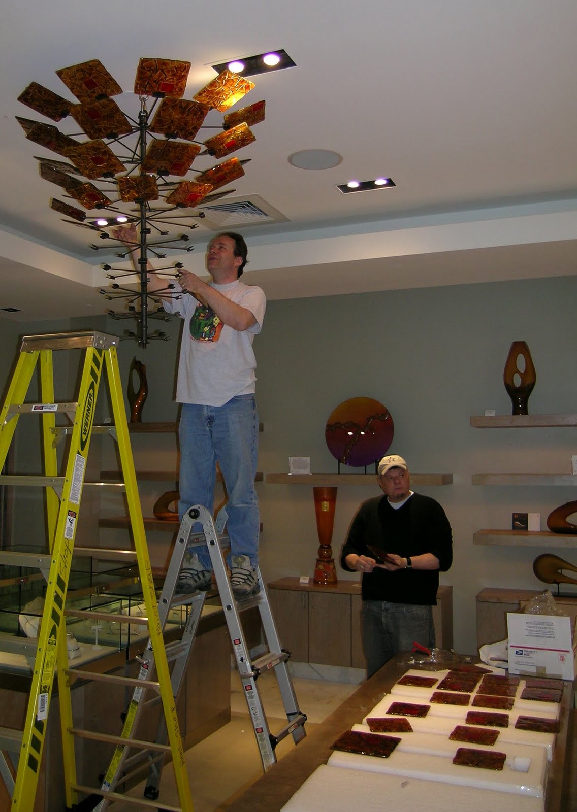 Erwin Timmers installs the components made from recycled glass into the ceiling mounted sculpture.