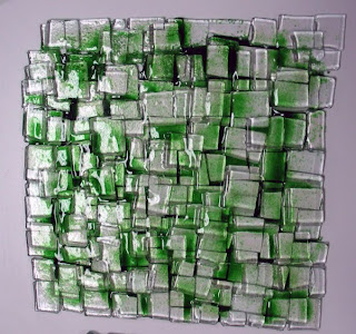 | Layered panel component sheets by Marilyn Dishman, Lynda Stoy and Deborah Enderle are fired to fix the frit powder on the glass and allow for further embellishment. |