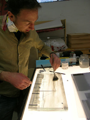 Rob Kincheloe coldworks the glass, evaluating the quality of the recycled float glass casting.