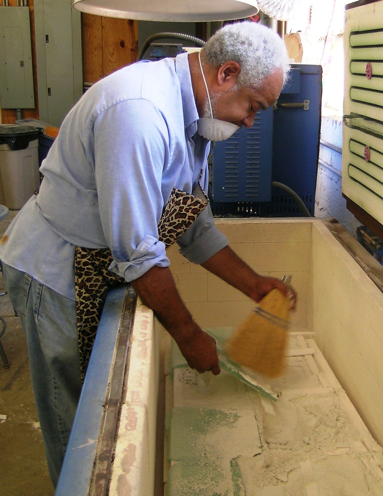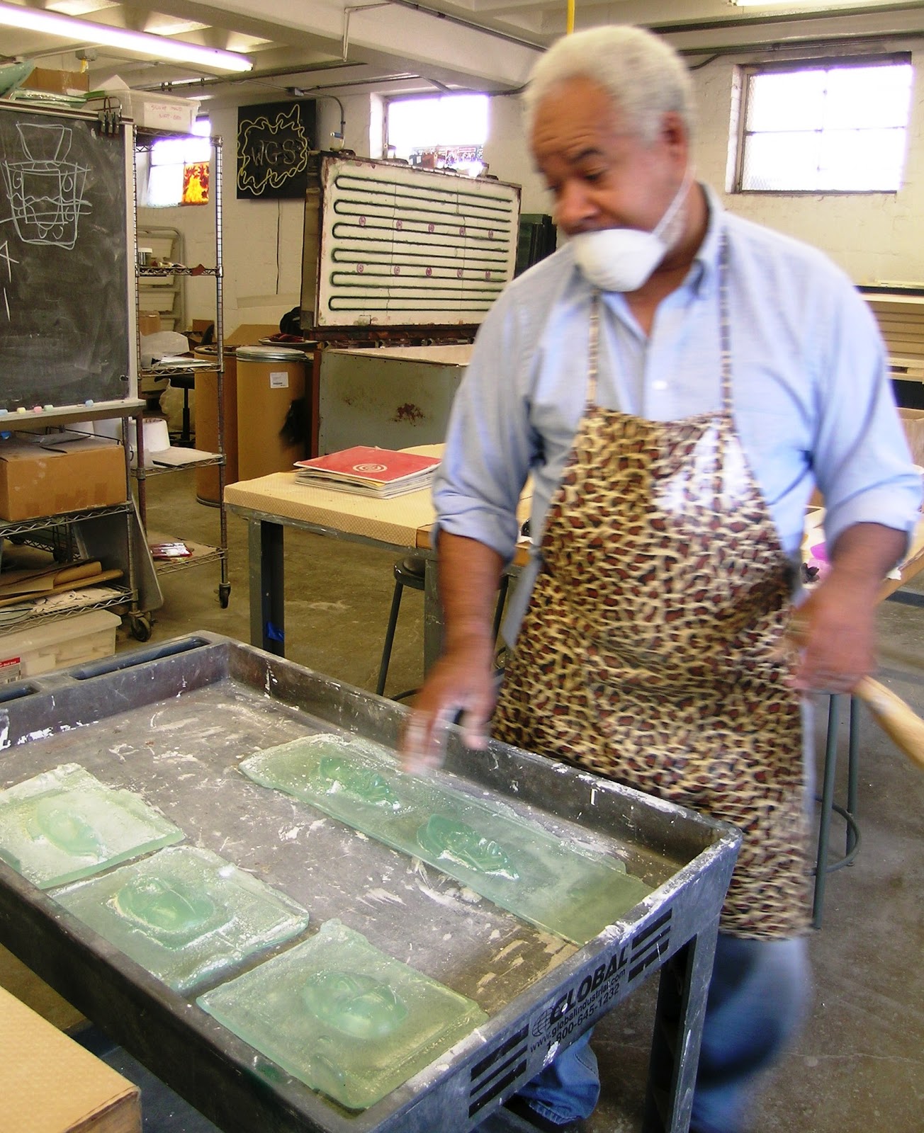 John’s new “Shield” series incorporates cast glass African imagery with metal and fused glass elements. And working with a water-cooled chop saw helps cool him down.