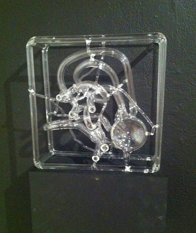 | Detail of Robert Kincheloe’s “Fire” plasma charged torchworked glass sculpture – put your hand to the glass and watch the charge move towards your fingertips. |