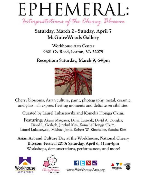 An exhibition on the ephemeral nature of the cherry blossom. Curated by Laurel Lukaszewski and Komelia Hongja Okim, the exhibition will explore fleeting moments captured in art and celebrate the cherry blossom and Asian and American relations. The exhibition will also feature a Cherry Blossom Festival at the Workhouse on April 6.